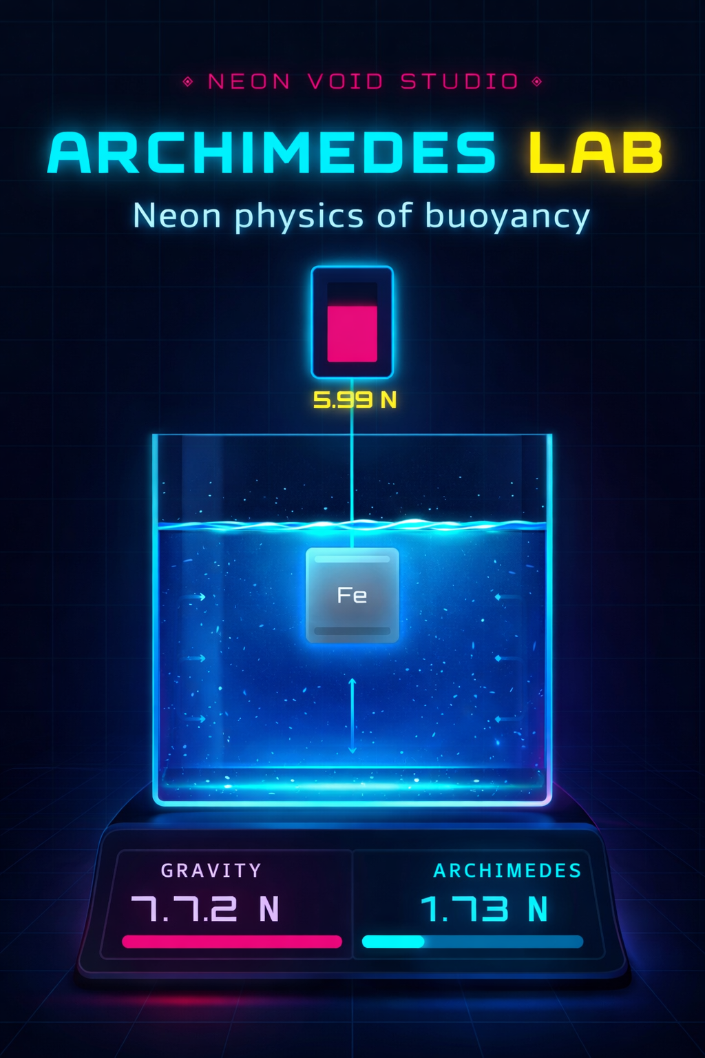 A neon-styled interactive physics lab where you can explore buoyancy, density, and Archimedes’ force in real time.