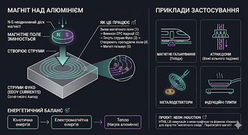 Маятник із неодимовим магнітом проходить крізь алюмінієвий блок. Змінне магнітне поле індукує вихрові струми сотень та тисяч Ампер — і вони миттєво гальмують рух (закон Ленца).